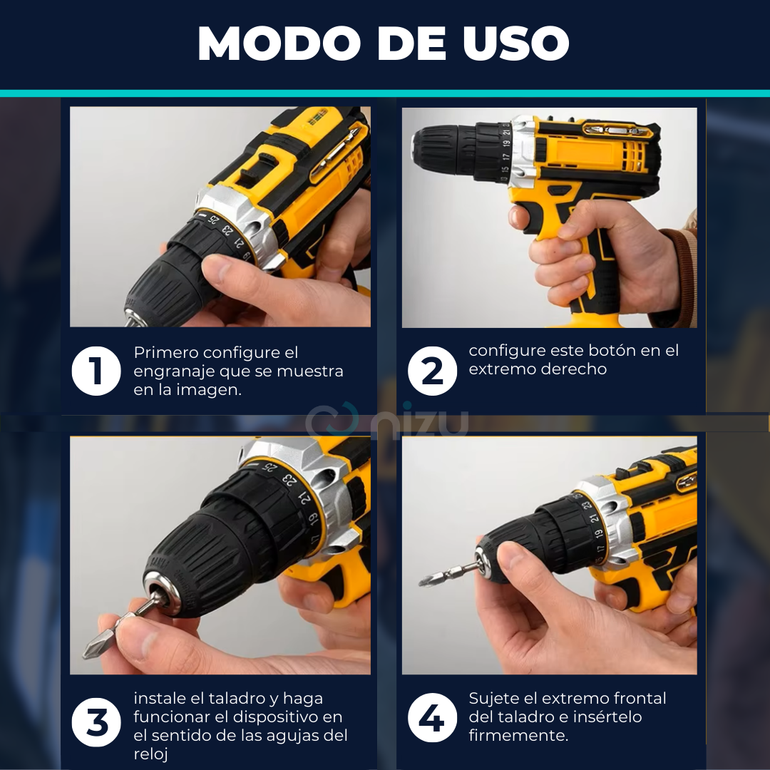 No tendrás que preocuparte más por no tener la herramienta adecuada, nuestro taladro inalámbrico viene con un juego completo de accesorios y un diseño seguro y fácil de manejar.